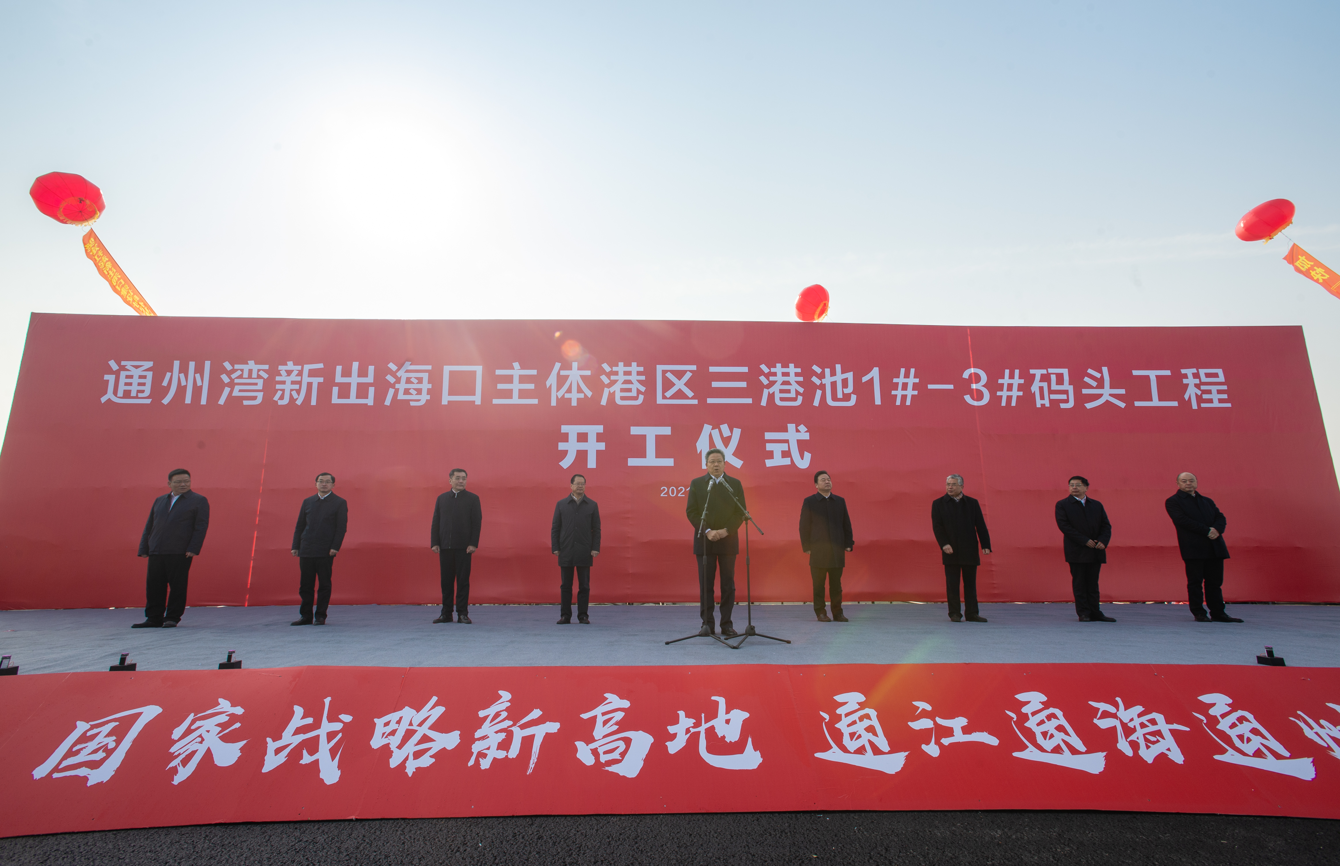 2021年12月30日上午,通州灣新出海口主體港區(qū)三港池1#-3#泊位碼頭工程正式開工,標(biāo)志著通州灣主體港區(qū)正式邁入“深水大港”時(shí)代。南通市委副書記、代市長(zhǎng)吳新明宣布開工。南通市委常委、常務(wù)副市長(zhǎng)、通州灣港口開發(fā)建設(shè)委員會(huì)主任、通州灣示范區(qū)黨工委書記陸衛(wèi)東,南通市人大常委會(huì)副主任陳俊,市政協(xié)副主席金元,市政府秘書長(zhǎng)凌屹、副秘書長(zhǎng)王國(guó)平,通州灣示范區(qū)黨工委副書記、管委會(huì)主任施宏杰,中交第三航務(wù)工程局有限公司董事長(zhǎng)王世峰,南通港(港口)集團(tuán)有限公司黨委書記、董事長(zhǎng)朱玉強(qiáng),黨委副書記、總經(jīng)理、副董事長(zhǎng)劉建出席活動(dòng)。通州灣港口開發(fā)建設(shè)委員會(huì)常務(wù)副主任施渠平主持開工儀式。